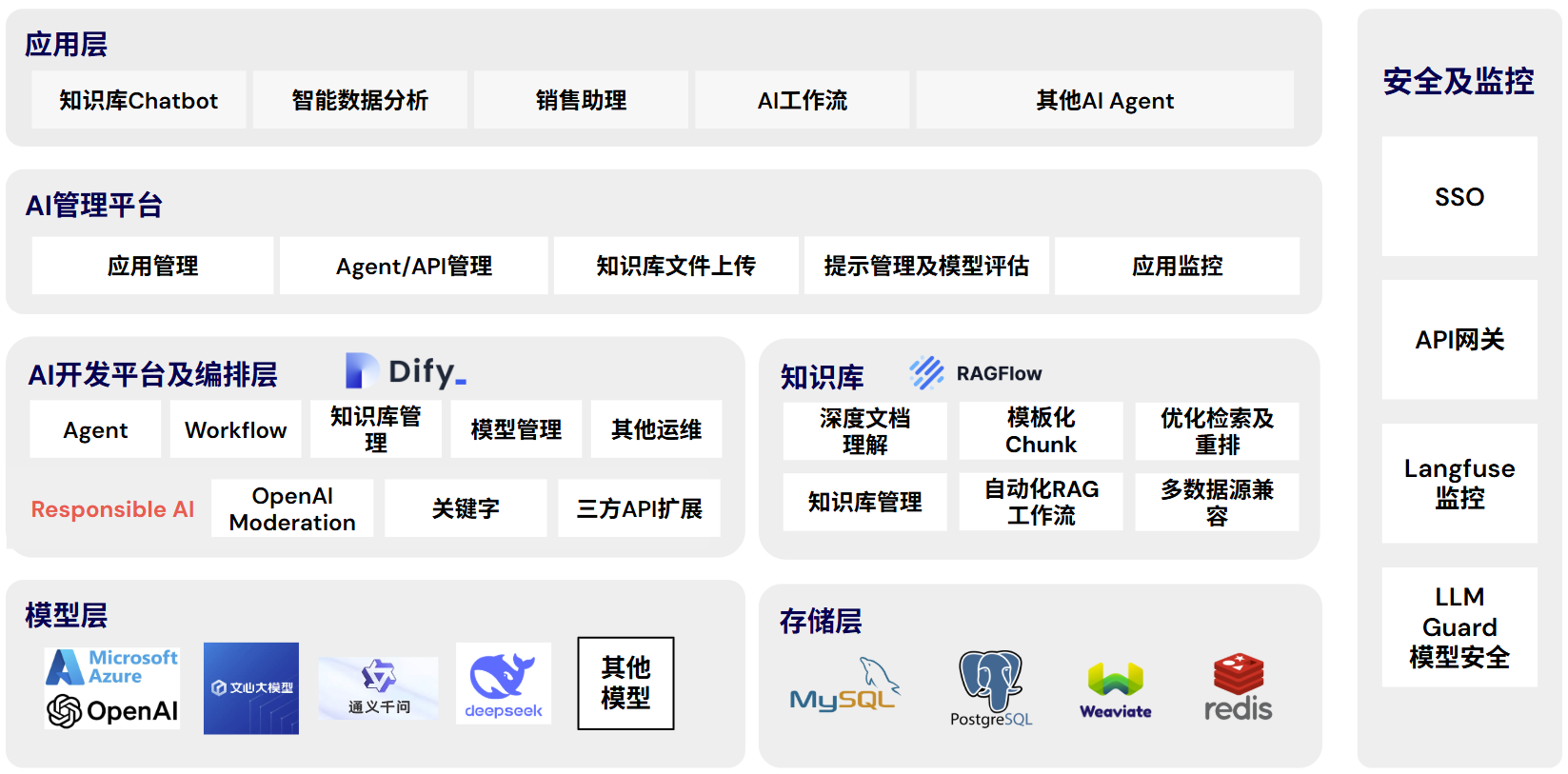 CI&T 企业AI中台 了解更多 CI&T 企业AI中台 CI&T 企业AI中台,旨在帮助企业高效、安全地落地GenAI应用,提升业务运营效率。该方案支持企业各种从简单到复杂的各种业务场景,并确保数据安全与合规。通过统一管理AI应用和资源,减少重复投入,加速AI从PoC到规模化落地,让企业更快享受AI驱动的业务增长。 基于开放生态方案 构建在 Dify、Langfuse 等成熟生态基础之上,结合 RAGFlow、LLM Guard 等工具,提供端到端的 AI 应用构建与治理能力。通过生态方案的集成,降低企业的二次开发成本,加速业务落地。 安全合规保障 统一管理企业认可的模型,集成SSO,并通过网关、监控、日志审计等机制,确保数据安全、访问可控,符合企业合规要求。 灵活性与可定制化 支持灵活部署,向客户开放源代码,满足企业个性化需求,支持扩展与深度定制,实现更高效的AI应用落地。 产品亮点 更开放的知识库能力 同时集成了 Dify 原生知识库与 RAGFlow的部分等知识库,并具备良好的可扩展性,可根据业务需求灵活接入更多知识库与应用。 模型评估能力 拥有AI 模型与Prompt评估能力,提供模型评估、Prompt管理、数据集管理的一体化能力,内置 Ragas 指标并可扩展自定义评估器,帮助企业快速构建 LLM的“评估-优化-发布”闭环。 模型安全管控能力 通过可视化界面集中管理和配置安全策略,这些策略会由本地部署的开源方案LLM Guard执行。在AI应用运行过程中,大模型安全统一网关分别在输入和输出阶段进行安全控制,从而有效降低提示注入、敏感信息泄露和违规内容生成等风险。 LLMOps及AI应用治理 构建了完整的 LLMOps 能力,通过集成 Dify 与 Langfuse,为企业大模型应用提供全链路监控与运维,确保系统的稳定性、透明性和可控性。 智能体及工作流编排 可视化构建和编排 AI 应用,让应用快速落地。 部分功能展示 联系我们的技术专家