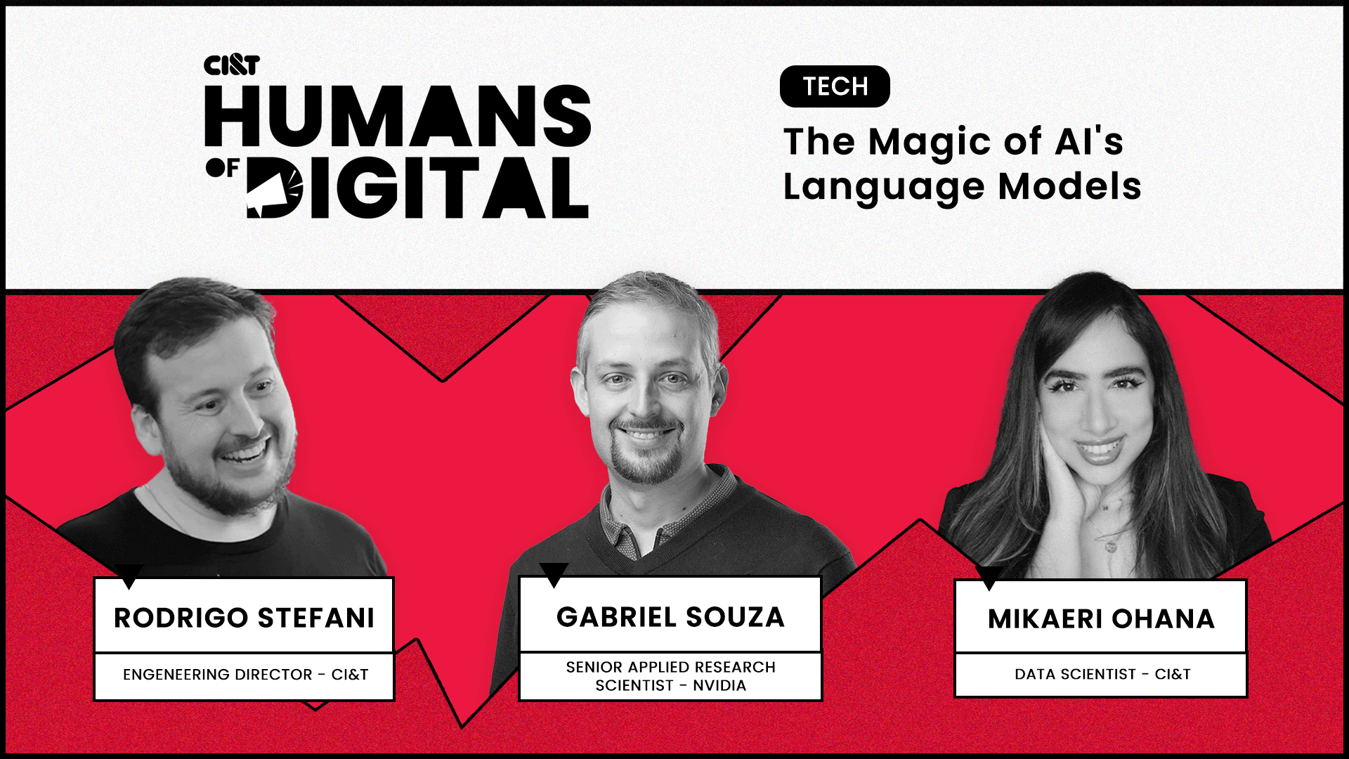Humans of Digital - Is AI the solution for business efficiency? Feb 22, 2024 | min read Digital TransformationInnovationTechnologyArtificial Intelligence Join Mikaeri (AI and ML Lead at CI&T), Rodrigo (Engineering VP for Americas at CI&T), and Gabriel (Senior Applied Research Scientist at NVIDIA) for an insightful conversation about the opportunities and challenges of using AI's Language Models (LLMs). They discuss everything from generative to discriminative tasks and emphasize the importance of responsible AI usage through the use of the right guardrails.Whether you're a seasoned AI enthusiast or new to the field, this episode offers a concise yet comprehensive overview of LLMs, shedding light on their implications for the future.You can listen to it on your favorite podcast platform or watch it here on YouTube. Listen to the episode here Participate in this episode Rodrigo Stefani Engineering Director, CI&T Mikaeri Ohana Data Scientist, CI&T